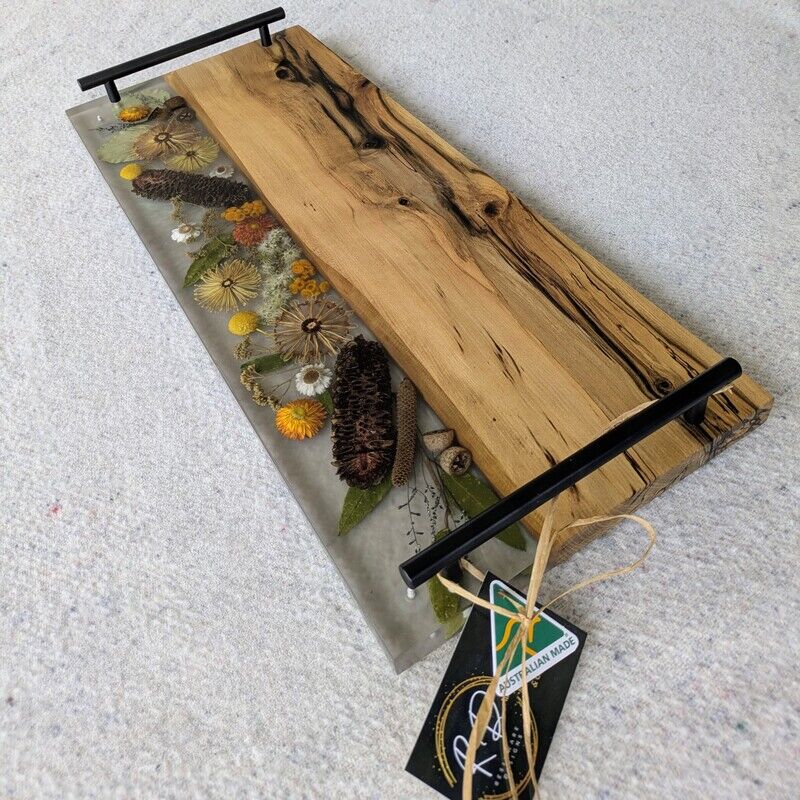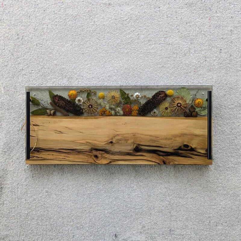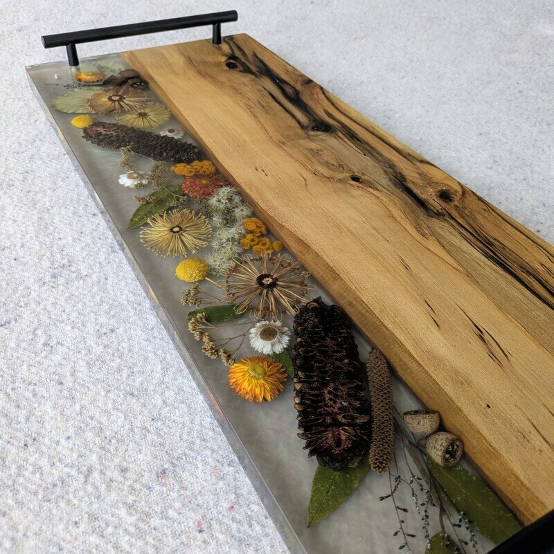 - Serving board Materials: Australian Blackheart Sassafras Timber, Australian Flora and Resin