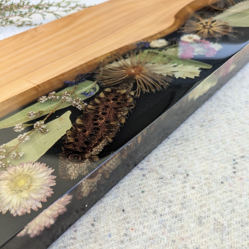 Designed to elevate your home decor, our cheese boards are not just serving essentials but exquisite pieces that showcase Australia’s stunning flora. Each board features carefully arranged dried native flora encased in translucent resin, creating a mesmerizing display of colors and textures. Whether displayed on your kitchen counter or used to serve guests, it becomes a focal point that sparks conversation and admiration.
